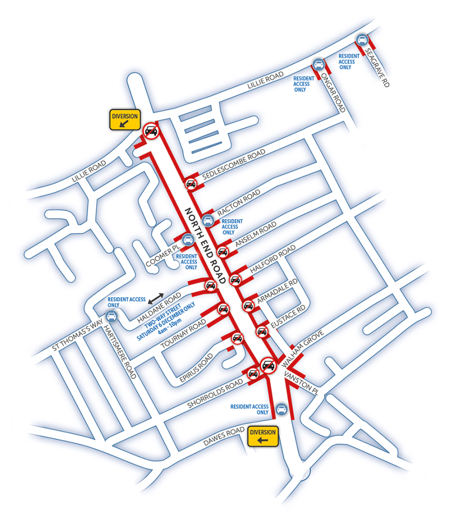 North End Road will be closed to traffic and diversions will be in place between Lillie Road and Dawes Road from 4am to 10pm.